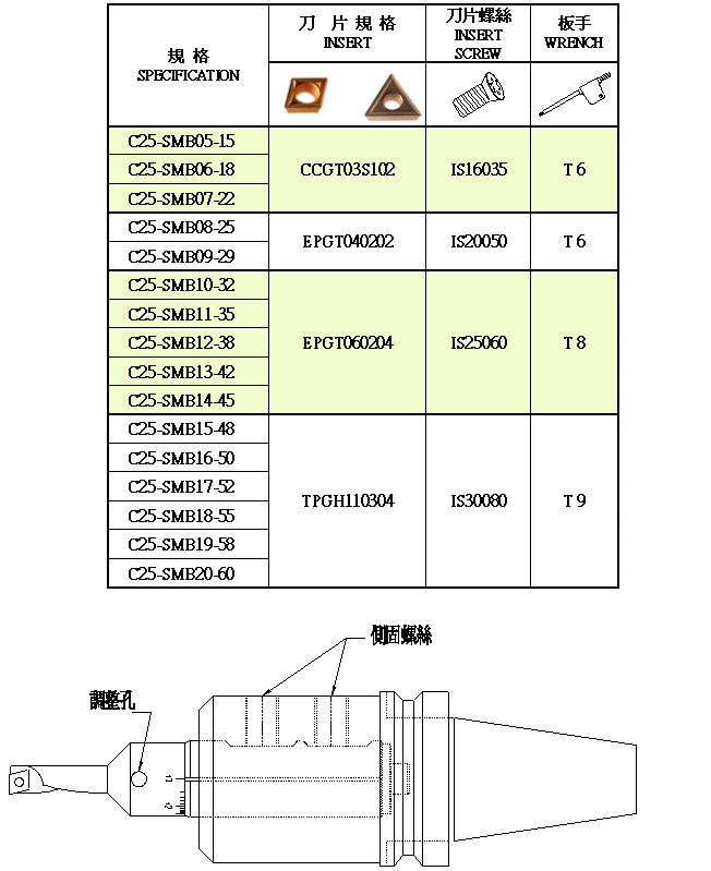 輕輕含緊側固螺絲,使板手插入調整孔,轉動刀子在仍可轉動之狀態。 |